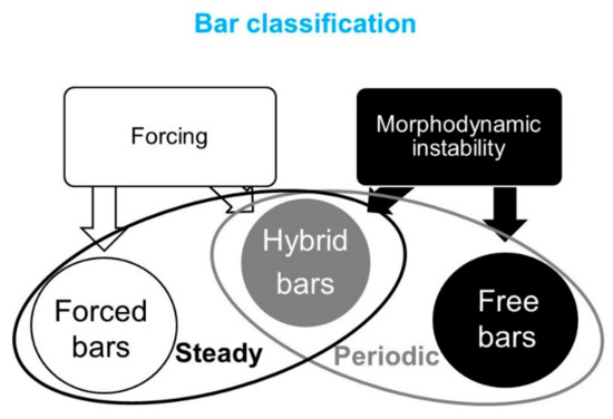 Bar studies include theoretical analyses [2,3,4,5,6,7,8,9,10,11], field observations [12,13,14], numerical modelling [3,15,16,17,18,19,20,21], as well as experimental investigations [22,23,24,25,26]. A comparative analysis integrating the results of these works is still lacking, so practitioners are confronted with publications treating only specific aspects of the overall picture. The use of different terminologies to distinguish different types of bars adds confusion, some terminologies related to mechanistic explanations (e.g., free bars, steady bars, forced bars, spatial bars, hybrid bars, migrating bars, central bars, braid bars), other terminologies to shapes (e.g., longitudinal bars, diagonal bars, transverse bars, crescentic bars, medial bars [27]).