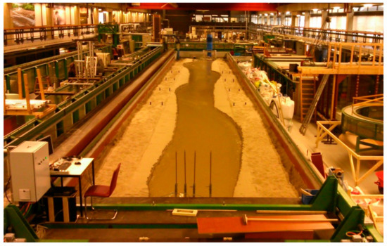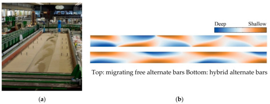 Bar processes have been studied in laboratory flumes since the 1970s [41]. Based on his experimental results, Ikeda [42] developed an empirical method to assess the wavelength and the amplitude of free alternate bars. Fujita and Muramoto [22] studied the free-bar evolution in a straight flume, showing that these bars elongate with time until they attain a stable length. Crosato et al. [26] showed that free alternate bars might present an unstable behavior, as they observed them to flatten suddenly repeatedly all together and then to reform. This was attributed to a forcing from the boundaries. Lanzoni performed long series of experiments in a straight channel with uniform [23] and non-uniform [24] sediment, observing that non-uniform sediment results in bars with smaller amplitude and that bars tend to become steady if the coarser fraction is only partly mobile. The formation of hybrid alternate bars has been generally obtained in the laboratory by adding some forcing, created by placing a transverse plate at the upstream boundary. Generally forming in the upstream half of the flume close to the source of forcing, hybrid bars were found to have wavelengths two to three times longer than those of the free bars that formed in the second half of the flume [23,25,35]. In general, hybrid bars were found to have wavelengths on the order of 10–15 times the channel width, but shorter wavelengths are also possible [35].