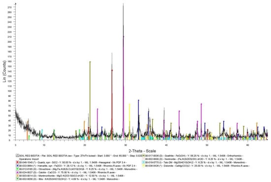 In Figure 1 the XRD diagram of soil 1 is presented. The results of the XRD analysis revealed that calcite is the predominant mineral phase and quartz a major to medium constituent. Hematite and goethite occur as medium to minor mineral phases and their co-existence reveals secondary processes (e.g., weathering). Dolomite occurs as a medium to minor crystallic phase (probably attributed to the geological background formations of the area, such as Triassic dolomites and dolomitic limestones). Moreover, illite, chlorite (clinochlore, an iron-rich clay mineral), talc and smectites (montmorillonite and nontronite, an iron-rich smectite) were determined as minor to trace minerals.
