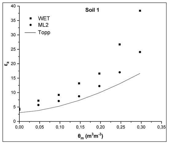 In Figure 2 and Figure 3, the relationships θm-εa, where εa was measured by the WET and ML2 sensors and was also calculated from the Topp equation (Equation (3)) for soils 1 and 2, are presented. The widely accepted Topp equation was used as a reference equation since is independent on soil type, soil temperature and soluble salt content.