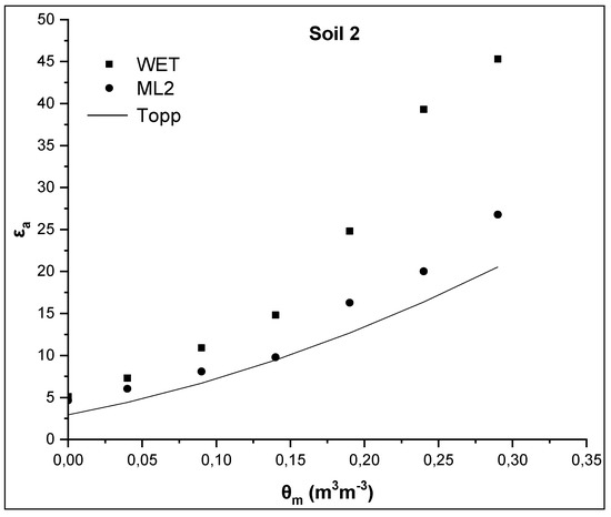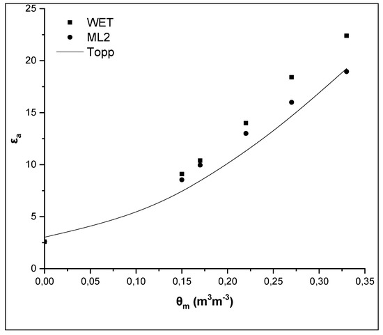 In correspondence with soil 1, similar results for the soil 2 are presented in Figure 3. Specifically, εa values measured by the WET and the ML2 sensor are 45.3 and 26.8, respectively, for the maximum value of actual soil water content θm = 0.29 m3m−3, whereas the εa value calculated by the Topp equation is 16.1. Compared to soil 1, it appears that the difference between the εa values measured by the two sensors increases and their difference from the predicted εa value from the Topp equation increases too as soil water content increases.