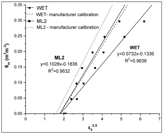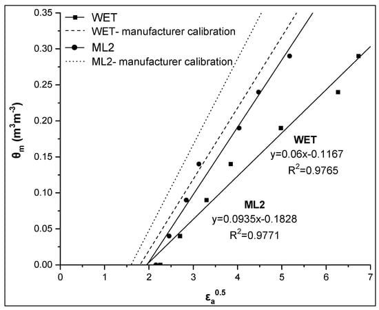 Comparative presentation of the relationships θm-εa0.5 obtained by the WET and ML2 sensors for soil 2. The corresponding relationships using the manufacturer calibration are also given for both sensors.