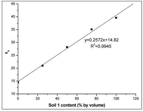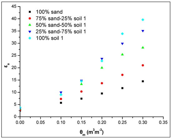 Therefore, there is a strong positive correlation between the soil 1 content and εa. The smallest value is obtained in 100% sand and as the soil 1 percentage increases in the soil mixture the εa increases remarkably (Figure 7).
