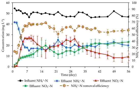 Changes in NH4+-N, NO2−-N, and NO3−-N concentration and NH4+-N removal efficiency over 56 days of operation. Values are means ± SD (n = 4).