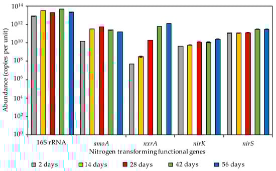 The abundances of bacterial 16S rRNA, amoA, nxrA, nirK, and nirS in the reactor over 56 days of operation are shown in Figure 3. The bacterial 16S rRNA gene abundance ranged from 8.2 × 1012 to 4.5 × 1013 copies per unit. The abundance of amoA significantly increased (P < 0.05) from 1.5 × 1010 to 3.3 × 1011 copies per unit within the initial 14 days and then reached and maintained a peak at 5.5 × 1011 copies per unit. The abundance of nxrA gradually and steadily increased from 5.2 × 107 to 1.3 × 1012 copies per unit over 56 days; thus, the AOB population and activity increased faster in the reactor than those of NOB. These changes in amoA and nxrA abundance corresponded to the changes in NH4+-N, NO2−-N, and NO3−-N concentration in the effluent (Figure 2). The AOB population should be larger than that of the NOB in balanced nitrifying systems [31,32]. The NOB population was smaller than the AOB population in wastewater treatment systems, such as in sequencing batch reactors [33] and in combined activated sludge-rotating biological contactor and anaerobic-anoxic-oxide (A2O) processes [34]. NOB growth is relatively slow in the absence of nitrite [35]. Similar to these previous reports, the AOB population increased more quickly in this reactor after the onset of the operation compared to the NOB population.
