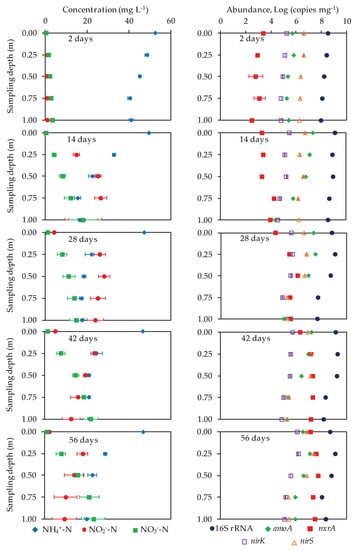 The biweekly NH4+-N, NO2−-N, and NO3−-N concentrations and the abundances of the functional bacterial genes (bacterial 16S rRNA, amoA, nxrA, nirK, and nirS) along the single axis of the nitrification units (from the top (influent) to the bottom (effluent; 1 m)) are shown in Figure 4. The NH4+-N concentration rapidly decreased from the top (0 m) to the middle (0.25–0.75 m) of the nitrification reactor. The NO2−-N concentration sharply increased from the top to the middle and then decreased gradually. The NO3−-N concentration gradually increased from the top to the bottom of the sponge units. The abundance of amoA was higher at the top than at the bottom. In contrast, the abundance of nxrA in the sponge units after 14 days of operation was higher in the middle to the bottom parts than in the top (Figure 4). Ammonium oxidation almost occurred in the upper parts, while nitrite oxidation almost occurred from the middle to the bottom of the units.