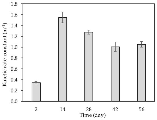 First-order kinetic constant (k1) for the decrease in NH4+-N concentration along the single axis of the dropping nitrification reactor over 56 days of operation. Values are means ± SD (n = 4).