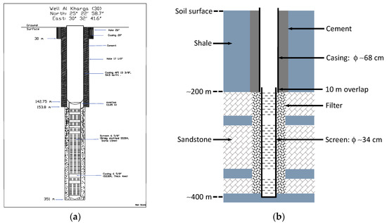 Information about the hydraulic properties of the Nubian sandstone aquifer in the Western Desert is limited and fragmented. Shata [3] assumed an average hydraulic conductivity of 5 m/d, which however seems too high for sandstone as reported in the literature, e.g., [13]. Ebraheem et al. [9] developed a regional groundwater flow model of the Nubian sandstone aquifer in the Western Desert and concluded that the transmissivity is 1100 m2/d for the Kharga oasis. Mahmod et al. [12,14] assumed transmissivity values in the range 50–500 m2/d for their groundwater model of the Nubian sandstone aquifer in the Kharga oasis. Elewa et al. [15] reported transmissivity values ranging from 11 m2/d to 1490 m2/d as a result of 90 pumping tests conducted in the Nubian sandstone aquifer in a large area in the Western Desert south of the Kharga oasis. Hamdam et al. [16] reported transmissivity values between 236 m2/d and 3045 m2/d as a result of 12 pumping tests conducted in the Nubian sandstone aquifer in the El-Bahariya oasis, about 300 km northwest of the Kharga oasis. Masoud and Osta [17] analyzed 26 pumping tests in the Nubian sandstone aquifer of the El-Bahariya oasis and reported transmissivity values between 191 m2/d and 970 m2/d; the discrepancy with the previous study was not explained.