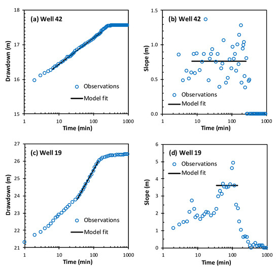 Plots showing drawdown against log-time for well 42 (a), slope of drawdown against log-time for well 42 (b), drawdown against log-time for well 19 (c) and slope of drawdown against log-time for well 19 (d); the solid line shows the straight-line fit to estimate the transmissivity.