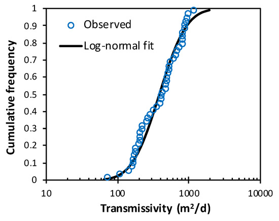 Cumulative frequency distribution of the estimated transmissivity and fitted log-normal distribution.