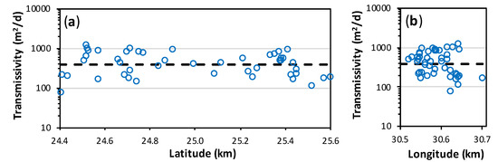 Transmissivity plotted against latitude (a) and against longitude (b); the dashed line represents the geometric mean transmissivity value of 385 m2/d.
