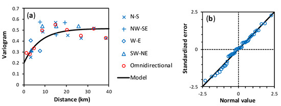 Empirical variogram in different directions and fitted omnidirectional exponential model variogram with parameters given in Table 2 (a); verification of the variogram model by cross-validation, showing the quantiles of the standardized errors and the corresponding quantiles from a standard normal distribution (b).