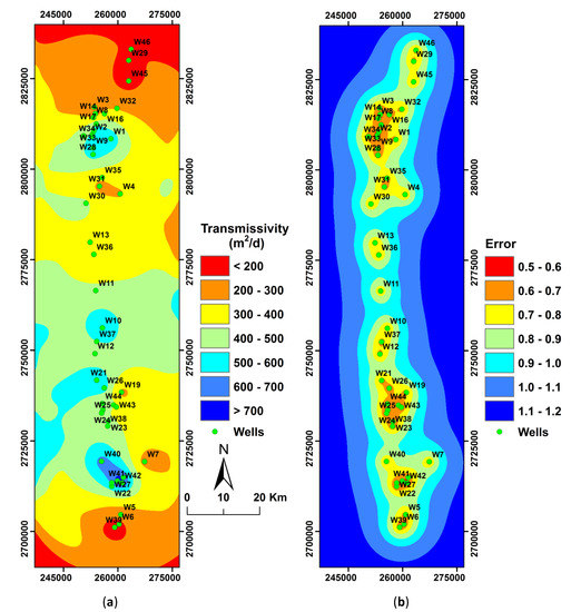 Figure 7a shows the map with the spatial distribution of the transmissivity obtained by ordinary kriging interpolation (Equation (7)) and the associated error map showing the spatial distribution of the kriging variance (Equation (8)) divided by the sample variance (Table 2).