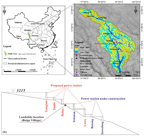 In October and November of 2018, two large-scale high-level landslides occurred at the junction of Baige Village, Polo Township, Jiangda County, Tibet Autonomous Region, and Zhaba Village, Ronggai Township, Baiyu County, Sichuan Province (on the Tibetan Bank, right bank), and these landslides blocked the mainstream of the Jinsha River and formed a landslide dam [18,19]. The Jinsha River comprises the upper reaches of the Yangtze River, with an average elevation of 3,720 m. The geographic position is between 90° to 105° East longitude and 24° to 36° North latitude (Figure 1a). At 10 PM local time on October 10, displaced material with a volume of approximately 23.5 million m3 moved downward quickly, reaching the river channel and forming a landslide dam with a maximum storage capacity of approximately 290 million m3. At 5 PM on November 3, 2018, a secondary landslide of approximately 2.5 million m3 on the same bank slope obstructed the Jinsha River again, forming a higher dam with an estimated maximum lake volume up to 770 million m3. Thus, a 220 m long channel was constructed for the complete draining of the lake on November 11. The lake began to overflow at 10:50 AM on the 12th, when the volume was approximately 5.5 million m3. Although an artificial spillway was built to discharge the lake at a relatively low water level, the outburst flood ultimately caused a total loss of 1.343 billion yuan for the power stations in the upper reaches of the Jinsha River with the collapse of more than 3,400 houses and damage to 3.5 thousand acres of farmlands. In addition, 102 thousand residents were affected, of which 86 thousand were urgently transferred.