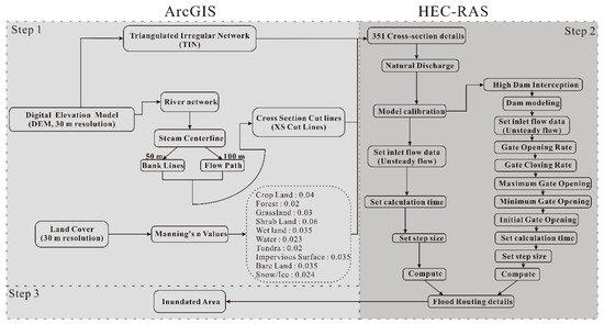 The flow chart illustrates the method used to simulate the flood process under natural discharge and high dam interception (ArcGIS is software of Geographic Information System; HEC-RAS is a tool of flow modeling).
