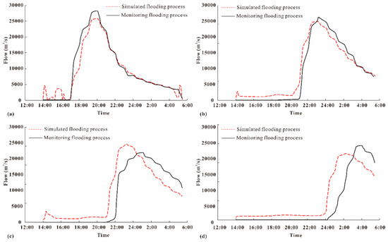 Actual outburst flood process curves and numerical simulation of flood process curves: (a) outburst flood curves at the Yebatan arch dam; (b) outburst flood curves at the Lawa hydropower station; (c) outburst flood curves at the Batang hydropower station; (d) outburst flood curves at the Suwalong hydropower station.