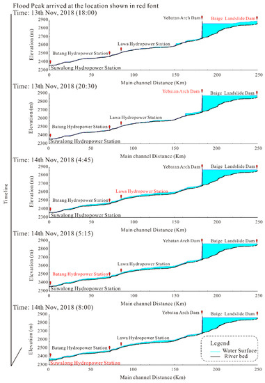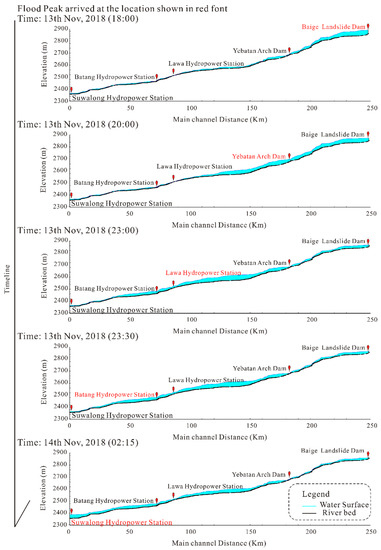 Figure 5 illustrates the outburst flood routing both in observed and in the simulated process. The flood peak arrived at the Baige landslide dam and the four cascade hydropower stations at 18:00, 20:00, and 23:15 on the 13th of Nov 2018 and at 1:40 and 3:50 on the 14th of Nov 2018. The initial study considered that woody debris, meanders, and vegetation within the channel could reduce the flow velocity, resulting in the attenuation of flood flows [25]. Hence, the flood curve at the Batang and Suwalong Hydropower Stations in the simulation appeared ahead of the real flood curve (shown in Figure 5). The water surface curves of the flood process are shown in Figure 6. Notably, when the flood peak arrived at the Lawa hydropower station, the flood at the Baige landslide dam was completely discharged. While the flood peak arrived at the Suwalong Hydropower Station, the flood at the Yebatan arch dam was completely discharged. After 16 hours of flooding, the flood peak reached the Suwalong Hydropower Station with a channel distance of 224 km, which also resulted in a large inundation area. The three-dimensional display of the natural flood discharge when the flood reached the downstream area is shown in Figure 7. As shown in the figure, the downstream inundation area was more significant. In addition, the total inundation area and that in the downstream of the Yebatan arch dam are presented in Figure 7. The latter was calculated for comparison with the inundation area after the engineering interception. The total inundation area increased from 2.07 × 107 m2 when the flood peak reached the Baige landslide dam to 2.64 × 107 m2 when the flood peak reached the Batang Hydropower Station. When the flood peak arrived at the Suwalong Hydropower Station, the total inundation area decreased to 2.58 × 107 m2, which may have resulted from the reduction in the upstream inundation area.