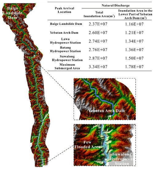 Figure 9 demonstrates the water surface through flood routing. The time when the flood peak reached the downstream hydropower stations was delayed, and the arrival time was 20:30 on the 13th of Nov 2018 and 4:45, 5:15, and 8:00 on the 14th of Nov 2018. Figure 9 shows that overtopping did not occur at the Yebatan arch dam. Furthermore, the flood curves are shown in Figure 10. All of the flood peaks of the hydropower station downstream of the Baige landslide dam were reduced sharply. The flood peaks at these four cascade hydropower stations were 8144 m3/s, 8818 m3/s, 8538 m3/s, and 6901 m3/s. The total inundation area and inundation area in the lower part of the Yebatan arch dam are shown in Figure 11. These two inundation areas both showed an increasing trend, and the inundation area in the lower part of the Yebatan arch dam was much smaller than the total inundation area. In addition, Figure 11 also shows the inundation area of the basin as the flood reached the downstream area. The figure shows that after the flood is mainly concentrated behind the Yebatan arch dam, the water depth at the downstream Suwalong Hydropower Station is relatively shallow.
