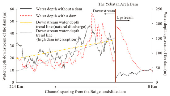 There are also differences in water depths between natural discharge and comprehensive flood control of blocking and draining. Figure 14 presents the maximum water depth of all sections with or without engineering interception. The figure shows that the water depth behind the dam was as much as approximately 200 m, and the water depth increased by nearly 150 m compared with the water levels without high dam interception. In addition, near the downstream area of the arch dam, the water depth of the natural discharge was also deeper than that of high dam interception. In the lower reaches of the Yebatan arch dam, the water depth was approximately 20 to 30 m and 10 to 20 m for natural discharge and with high dam interception, respectively. The water depth with high dam interception was reduced by approximately 10 m compared to that without high dam interception. The water depth is directly related to the inundation area and is a very important index that is used to describe the flood process. A ten-meter reduction in the downstream water depth means that the downstream flood risks were greatly reduced.