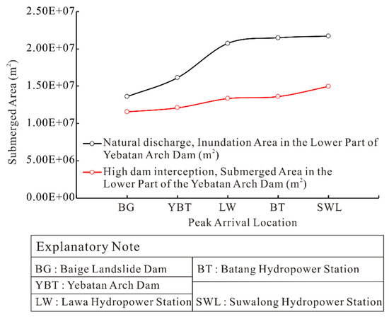 The entire flooding process is a disaster-causing process, which includes the flooding of farmland and the destruction of houses. The natural discharge of the Baige landslide dam has caused significant losses downstream. When considering the comprehensive flood control of blocking and draining, the flood process also undergoes tremendous changes in the most dangerous situations. Figure 15 demonstrates the inundation areas of both the natural discharge and high dam interception. This figure shows the inundation area downstream of the Yebatan arch dam when the flood peak reached the Baige landslide dam, Yebatan arch dam, Lawa hydropower station, Batang hydropower station, and Suwalong hydropower station. For the natural discharge, the flood peaks evolved downstream, and the inundation area increased at a faster rate. When the flood peak reached the Lawa Hydropower Station, the inundation area close to the Yebatan arch dam gradually decreased due to discharge, and although the inundation area in the downstream area increased rapidly, the total flooded area showed a tendency to slowly increase. When there was high dam interception, the inundation area showed a slow growth trend. The inundation area after engineering interception was greatly reduced, and the area of the downstream inundation area was more obvious. When the flood peak arrived at the Baige landslide dam and Yebatan hydropower station, the inundation area decreased by approximately 20%. When the flood evolved to the Lawa hydropower station, the Batang hydropower station, and the Suwalong hydropower station, the inundation area reduced to half of that for the natural discharge. The reduction in the inundation area from the construction of dams can effectively reduce the risk of downstream disasters.