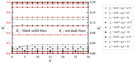 The analytical solutions of water waves comprise evanescent wave sequences and need to determine the number of evanescent modes in the computation. Figure 1 illustrates the computed coefficients of wave reflection and transmission versus the number of evanescent modes used in the study. The computational conditions are listed in Table 1. Nine sets of conditions are used in the computation, including combinations of three wave conditions and three linear vegetation friction factors: π/15, π/5, and 2π, and , , and . The results show that the coefficients of wave reflection and transmission can achieve good convergence below ten evanescent modes. In this study, N = 20 is used for subsequent calculations and analysis.