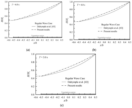 For the regular waves, Figure 4 and Figure 5 show the comparisons of between the analytical solution and the regular wave transformation model of Dalrymple et al. [43]. The RMSE and COR coefficients of for the proposed solution are listed in Table 3. The theoretical results of this study are also consistent with the wave heights in front of and behind vegetation fields.