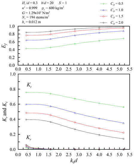 The drag coefficient, , owing to the effect of emergent vegetation, is generally related to the characteristics of the plant (geometry, stem density, spatial coverage, buoyancy, stiffness, etc.) and the hydrodynamic conditions (water depth, wave period, wave height, etc.). To investigate the influence of the drag coefficient of the emergent vegetation, the set of input conditions of water waves and vegetation used for the computations were 0.3; 0.3 m; 20; 1.0285; 0.012 m; 194 steams/m2; 1; 0.333; 0.999; 600 kg/m3; 1000 kg/m3; 1.12 × m2/s; 4.35 × m2/N; 1.29 × N/m2; and 0.5, 1.0, 1.5, and 2.0. The variations in and , and the energy dissipation, , as a function of for , are revealed in Figure 6. The wave reflection is marginal, and the reflectance is only slightly increased when the wave condition, , is less than 1.5. This is mainly because the vegetation is highly permeable and most of the wave energy passes through the vegetation. As decreases (towards shallow-water conditions), the wave transmission increases gradually and then tends to reach a certain value, and the wave energy dissipates gradually and then tends to reach a constant value. In addition, as the drag coefficient, , increases, the wave energy dissipation, , increases, and the wave transmission, , decreases.