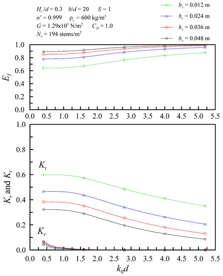 Figure 8 reveals the reflection, transmission and energy dissipation with the stem density 48.5, 97, 194, and 388 steams/m2. The drag coefficient, , and the remaining input conditions of water waves and vegetation are the same as in Figure 6. The results show that as the stem density increases, the denser flora affect waves passing through the vegetation fields, causing more energy dissipation and resulting in a decrease in the wave transmission.