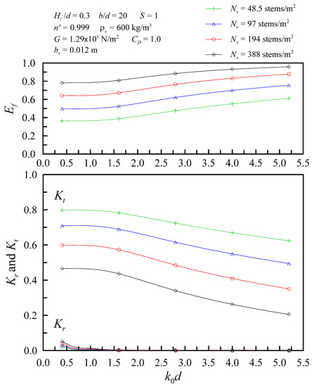 Effect of the stem density of vegetation on , , and ( 0.3, 0.3 m, 20, 1.0285, 0.012 m, 1.0, 1, 0.333, 0.999, 600 kg/m3, 1000 kg/m3, 1.12 × m2/s, 4.35 × m2/N, and 1.29 × N/m2).