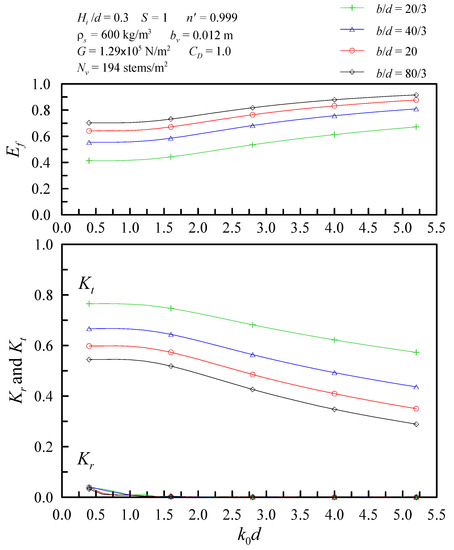 Figure 7 shows the reflection, transmission, and energy dissipation with the plant stem diameter, 0.012, 0.024, 0.036, and 0.048 m, when the drag coefficient, , is equal to 1. The remaining input conditions of the water waves and vegetation are the same as in Figure 6. It is shown that that even if the vegetation drag coefficient is constant, as the stem diameter increases, the wave is hindered by the plants and induces larger energy dissipation in the vegetation field, resulting in a decrease in the wave transmission.