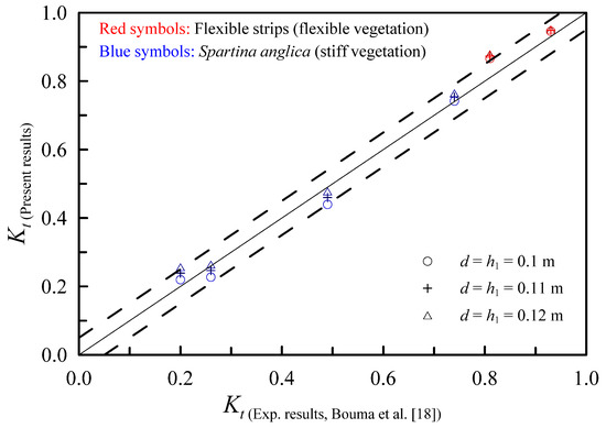 Figure 10 reveals a corresponding comparison of the transmission coefficient obtained in the experimental results of Bouma et al. [18] and the present computations. The physical properties of plant characteristics and wave data for experimentation are listed in Table 4. The experiment of Bouma et al. belongs to the wave attenuation experiment on near-emergent vegetation (because the vegetation height is slightly lower than the water depth in the experimental observation section). The vegetation height must be equal to the water depth for the present analytical solution, so three scenarios ( 0.1, 0.11, and 0.12 m) were computed for comparison. The horizontal and vertical coordinate components of the points in Figure 10 respectively represent the wave transmission coefficient of experimentation (Kt (Exp. Results, Boumaet al. [18])) and that of the present computation (Kt (Present results)). The points would coincide with the solid oblique line in Figure 10 when Kt (Present results) = Kt (Exp. Results, Boumaet al. [18]). The range of dashed lines indicates that the calculation error of Kt is within 5%, which is generally the allowable range in practical applications. Figure 10 shows reasonable comparison results, indicating that the proposed analytical solution can be applied to the analysis of practical cases, including the condition of flexible vegetation.