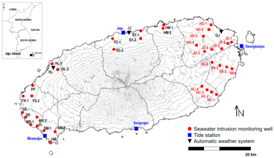 Most volcanic islands, to a large extent, depend on coastal aquifers for their water supply because surface water is rarely available due to the high permeability of basalts. However, in coastal areas, the seawater intrusion phenomenon is becoming more serious due to the disruption of natural hydrological conditions by climate change, rising sea level, and intensive groundwater extraction [1]. Therefore, establishing appropriate strategies for groundwater utilization and sustainability has become a major concern on volcanic islands. Seawater intrusion and basaltic aquifers have received significant attention from many researchers around the world [2,3,4]. Various methodologies have been suggested in the contributions that use innovative hydrogeological, geophysical, and geochemical monitoring for field scale characterization [5,6,7]. Nevertheless, it is very difficult to effectively characterize groundwater systems because of the unique geological features of basalt on a volcanic island. Basalts are mostly composed of basaltic lava flows that are either permeable or have low permeable hydraulic conductivity, and this lithological variability makes hydrogeological characterization difficult [8,9]. Therefore, until recently, many studies have highlighted the need for high-resolution studies in volcanic aquifers. Lachassagne et al. [10] presented a high-resolution conceptual model for complex basaltic volcanic islands to solve applied geology and hydrogeology problems.