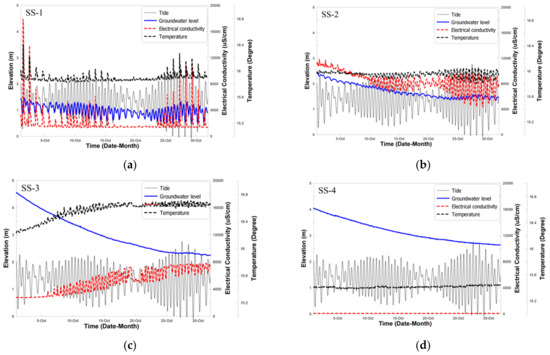 Temporal variation of ocean tide level, groundwater level, electrical conductivity, and temperature in seawater intrusion monitoring wells. Boreholes (a) SS-1; (b) SS-2; (c) SS-3; and (d) SS-4.