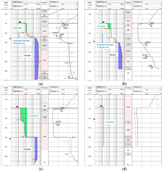 Under natural conditions, the seaward movement of freshwater prevents saltwater from intruding into coastal aquifers, and the interface between freshwater and saltwater is maintained near the coast or far below the land surface because of the density difference. Depending on the degree of seawater intrusion and aquifer properties, this interface can be sharp or a transition zone in which freshwater and saltwater mix. Borehole temperature logs employ resistance thermometers and give continuous temperature readings. Temperature logging is the most widely used detection method for aquifer thickness in regions where deep exploration wells penetrate the effective base of the aquifer. These logs provide useful information about the large-scale horizontal and vertical movements of groundwater [49,50]. Fluid electrical conductivity logs are records of the capacity of the borehole fluid that enters the probe to transmit an electric current. These logs allow for the determination of the general quality of well water and evaluation of the hydrological properties of fractures, fracture zones, or other permeable layers intersecting a borehole. Furthermore, under a wide range of conditions, these logs are used to trace the movement of groundwater in permeable layers by injecting water of constant salinity that is different from that of the formation water [51]. In seawater intrusion monitoring wells, temperature and electrical conductivity logging enabled us to delineate the freshwater–saltwater interfaces and how they changed with depth. The classification of water quality of coastal groundwater, which is freshwater, mixed water, and saltwater, is expressed by total dissolved solid (TDS). It is known that freshwater has a TDS concentration of less than 1000 mg/L, implying the upper limit of freshwater for suitability for human consumption [52]. In our analysis, the standard for defining the freshwater–saltwater interface was followed using the Hwang’s relationship between the groundwater electrical conductivity and total dissolved solids from the hydrochemical analysis of groundwater samples [53]: