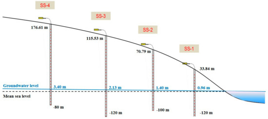At borehole SS-2, electrical conductivity increased slowly, and a thick transition zone formed between the depths of −20 and −40 m amsl (Figure 3b). Unlike borehole SS-1, the profiles presented step-like increases in electrical conductivity, indicating that this transition zone can have different hydraulic properties from the surrounding layers. It has been documented that step-like increases in electrical conductivity and temperature are observed with sudden changes over the boundaries of a fracture or aquifer zone [56]. There was little seasonal variation in electrical conductivity. Electrical conductivity of borehole SS-3 showed evidence of a sharp interface at the depth of −60 m amsl and reached up to 30,000 μS/cm in the saltwater zone (Figure 3c). Note that, as in borehole SS-1, there was a sudden decrease of electrical conductivity below the depth of −105 m amsl, which is thought to be part of the saltwater zone. No distinct variation of electrical conductivity was detected at borehole SS-4, thus, this area belongs to the freshwater zone according to the electrical conductivity values (Figure 3d). The vertical profiles of electrical conductivity represent patterns typical of a freshwater–saltwater interface. These patterns, generally, are divided into three classes: sharp interface, transition zone, and a combination of the two. In Susan district, the interface between freshwater and saltwater at boreholes SS-1 and SS-2 had a transition zone, and SS-3 had a sharp interface. The freshwater body gradually thickened in boreholes located farther inland. The transition zone thickened from SS-1 to SS-2, and finally to SS-3. Borehole SS-4 had a low electrical conductivity concentration of 150 μS/cm. On the basis of these findings, the toe of the freshwater–saltwater interface was placed between boreholes SS-3 and SS-4 in this district.