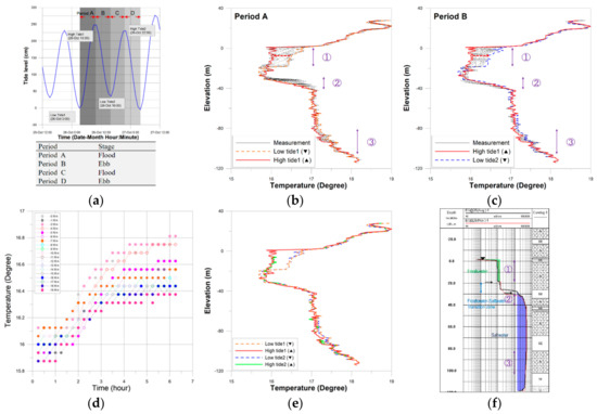 During Period B, the same situations appeared inversely (Figure 6c). In Zone 1, the temperature gradually started to increase after 90 min during ebb tide (Figure 6d). This monitored temporal increase of temperature implied that freshwater flow inland was taking place. The temperature profile in all four periods showed no significant change of the freshwater–saltwater interface due to tidal fluctuations (Figure 6e). In addition, the absolute values of temperature at the two high tides (or low tides) clearly demonstrated the influence of tidal fluctuations on vertically heterogeneous coastal aquifers. Consequently, it was verified that the freshwater and saltwater moved alternately in opposite directions of tidal fluctuations through the main aquifers.