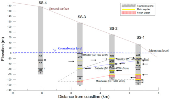 The conceptual model of the heterogeneous coastal aquifer system was suggested by interpreting the data resulting from geophysical well logging and borehole temperature monitoring at the seawater intrusion monitoring wells (Figure 8). At borehole SS-1, the closest borehole to the coast, interfaces between freshwater and saltwater form at –18 and −28 m amsl, and the transition zone is about 10 m thick. These interfaces occur at the boundaries of augite olivine basalt and scoria. Although the interface is governed by seasonal variation, there is no noticeable change with tidal fluctuation. At borehole SS-2, a thick transition zone forms between −20 and −40 m amsl. There is little variation in the saltwater–freshwater interface due to seasonal variation. At borehole SS-3, a sharp interface appears at the depth of −60 m amsl. Borehole SS-4 is located within the freshwater zone. The freshwater body gradually thickens as it moves inland, and the transition zone thickens up to 3.2 km inland from the coast, and finally disappears at less than 5.4 km inland from the coast. The toe of the freshwater–saltwater interface is located between 5.4 and 8.1 km inland from the coast. A low electrical conductivity zone exists below the depths of −82 m amsl (SS-1) and −105 m amsl (SS-3). Multilayered aquifers are expressed by solid yellow lines in each borehole. The behavior of freshwater and saltwater under flood conditions is denoted by arrows. As the sea level rises, seawater tends to move inland and flow through the main aquifer between −40 to −82 m amsl beneath the transition zone. As seawater intrudes farther inland, freshwater in the upper part of the borehole moves in the opposite direction. Consequently, freshwater–saltwater interfaces and aquifers mostly form the geological boundaries, implying that coastal aquifers flow through the boundaries between volcanic formations.