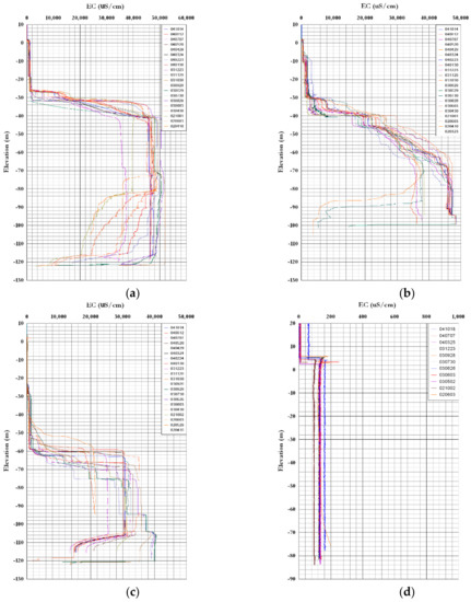 Periodic electrical conductivity logs from 2002 to 2004 (Institute of Environmental Resource Research, Jeju Special Self-Governing Province). Boreholes (a) SS-1; (b) SS-2; (c) SS-3; and (d) SS-4.