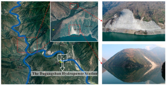 Frequent landslides have long motivated research into slope stability under various conditions [1,2,3,4,5,6,7,8,9]. Continuous research and field investigations have shown that geometric configuration is an important factor in the stability of both natural and constructed slopes [10,11,12,13,14,15]. However, the topographic effect on slope stability under fluctuating water conditions has rarely been investigated, even though slope deformation and instability occur frequently in reservoir areas [16,17,18,19,20,21,22]. As shown in Figure 1, with the Dagangshan Hydropower Station Reservoir area as an example, both the strike direction of the river and the slope angle around it change in a complex manner, often resulting in slope failures of different degrees. Moreover, the hydraulic conditions of the slopes in the reservoir area are very complex, as shown in Figure 2. On one hand, the poor properties of the slope mass cover layer reduce the overall slope stability, even for slope masses with reduced strength and complex seepage environments due to water level fluctuations [23]. On the other hand, most natural and constructed slopes exhibit a complex geometric configuration and three-dimensional (3D) state, which greatly increases the slope stability variability and calculation complexity. Coupled with the regular and sudden water level fluctuations, the topographic effect on slope stability considering saturated and unsaturated conditions urgently require research.