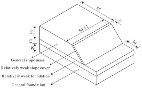 First, a general 3D slope model was constructed by extending the 2D model longitudinally. The geometric and soil information is given in Figure 3. The height of each slope was set to 30 m, and the bank slope subjected to water level fluctuations was divided into two identical 50-m long slopes by the axis of symmetry at the turning point. Considering the heterogeneity of slope soil and the inferior cover layer properties, the slope and foundation consist of two parts with poor and good soil conditions, respectively. The model has four different types of soil mass: the relatively weak cover layer, the general slope mass, the relatively weak foundation and the general foundation. The cover layer is 5 m thick. The general soil mass outside the turning corner range was set to at least 85 m in thickness to avoid the effect of water level fluctuations on the seepage field. There is no flow in the furthest soil mass by default. The foundation is a total of 30 m high, with a 10-m high relatively weak foundation.
