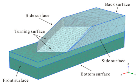In addition, the boundary conditions assumed in the 3D numerical model were important; many scholars have investigated the boundary effects with different methods [27,28,66]. For a 3D slope with any complex shape, as shown in Figure 5, boundary surfaces generally fall into five categories (bottom surface, front surface, turning surface, back surface and side surface) [13]. In this study, all movements were restrained (in the normal, dip and strike directions) in the bottom plane of the model (i.e., ux, y, z = 0, where u is the displacement). The front surface and back surface were restrained in the normal direction, but free to move in the dip and strike directions. However, the boundary conditions for the side surfaces were flexible (generally classified into three types) as discussed in [11,12,13,27]. In this study, the side surface condition was set comparing the results and conclusions in previous studies. Combining the practices in the studied models, to reduce calculation time, the side surfaces were restrained only in the normal direction for the convex-shaped slopes (corner angles of 90°, 120°, 135° and 150°) to determine the actual slope failure mechanism. The side surfaces were completely restrained (in three directions) for concave-shaped slopes (with corner angles of 210°, 225°, 240° and 270°) to investigate the constraining effects of the turning corner and avoid a landslide near the side surfaces.