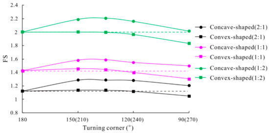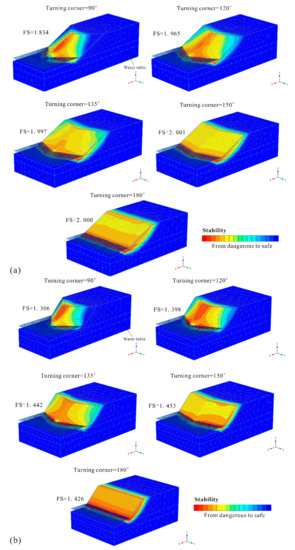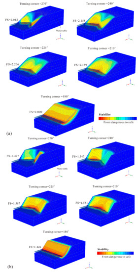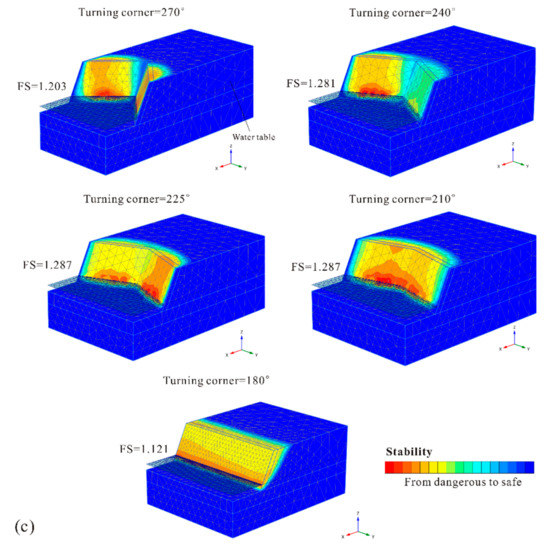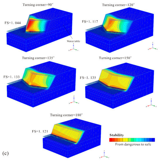 For convex-shaped slopes, a turning corner usually has negative effects on stability, especially when the corner is relatively small and the thinner exposed slope mass greatly reduced the slope stability. Only when the turning corners were sufficiently large (150° to 135°) that they showed similar security as the 2D extending model (180°). In engineering practice, the slopes with small turning corners may be more unstable. In the reservoir area, under the influence of common water level fluctuations, those slopes are prone to deformation and even failure. Thus, the very small turning corner should be avoided (e.g., <120°). When it is necessary to learn the impact of other turning corners in different valves on stability, engineers can determine the range of influence based on the interpolation method with Figure 6.
