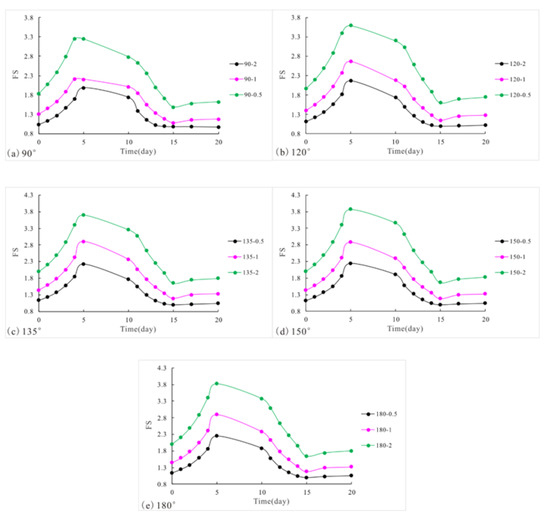 In engineering practice, water level fluctuation is a common phenomenon acting on the bank slope of the reservoir area. Regular water storage and drainage in reservoirs may cause slope instability, such as the landslides that occurred at the Three Gorges Reservoir area in China [16,17,18,19,20,21,22,23]. It is then conceivable that rapid water level fluctuations may lead to higher risks to slope deformation and stability. In this study, rapid rise and sharp drawdown water level fluctuation conditions were considered, with the continuous infiltration at the high water level and the successive slope drainage at the low water level. The slope mass safety factor was obtained for calculated time steps; the results are shown in Figure 11.