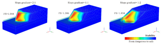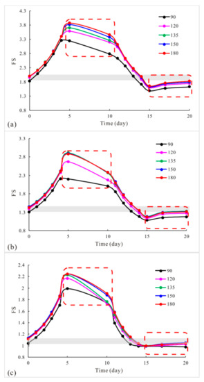 In this study, three slope gradients (2:1, 1:1, and 1:2 from steep to gentle, respectively) were calculated and analyzed successfully considering the unsaturated zone and conditions above the phreatic line. As shown in Figure 9, one routine conclusion was confirmed that the steeper the slope was, the lower the level of safety was. This result verifies the disturbance sensitivity of steep slope soil. Additionally, the safety factor variations of all three slope gradients in each water fluctuation time step are shown in Figure 9. Slopes with gentler gradients always had the highest stability at any point in the water fluctuations. Furthermore, the slope gradient did not have a significant effect on the safety factor variation pattern due to water fluctuations.