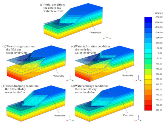 The pore water environment for different time steps is shown in Figure 12. In numerical calculation time, the zeroth day was set to calculate the seepage and stability of the bank slope for the normal water level condition considering steady-state groundwater flow. The slope calculation models remained stable initially. The rapid water level rise of 20 m was then set evenly from the first day to the fifth day under the transient (time-dependent) groundwater flow. Immediately after the rapid rise, a steady-state groundwater flow condition was assumed for the next five days (sixth to tenth days) considering continuous infiltration at a high water level. As shown in Figure 11, the stability increased as the water level rose, but decreased with continuous infiltration. The former result illustrates the beneficial effect of the water pressure acting as a back pressure. The latter result indicates the adverse effects of water infiltration caused by the increase in pore pressure. After a five-day high water level, from the eleventh day on, the water level dropped sharply for five days until the twentieth day, successively followed with a five-day drainage at the low water level. The slope stability decreased as the water level decreased, resulting in an even lower stability than the initial condition, due to the adverse effects of pore pressure. Thus, the slight increase in stability with the drainage of water over the next five days can be easily understood.