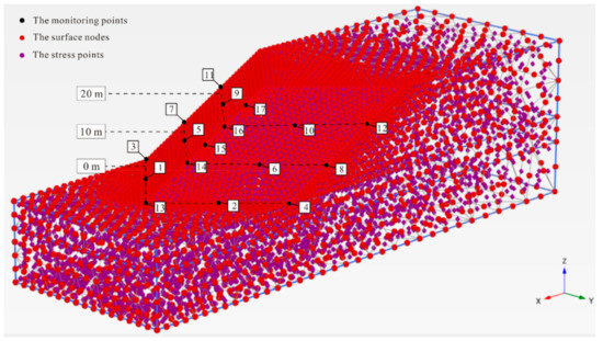 Figure 13 shows this study’s model calculation nodes. The model surfaces are represented by many nodes, and the stress points can be seen in the model body. The displacement data for 17 monitoring nodes were obtained. Their positions in the model are highlighted in Figure 13, representing the condition of the turning surface. Divided into two parts by the axis of symmetry, 5 columns of monitoring nodes on the turning surface were symmetrically distributed. Four columns of the nodes (nodes 1–12) were positioned on the outmost and the middle of the two surface parts, at heights of 0, 10 and 20 m, respectively. The remaining columns of nodes (node 13–17) were distributed on the model’s symmetry axis, at heights of 0, 10, 15, 20 and 25 m, respectively.
