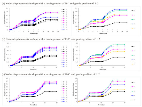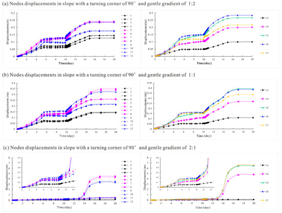 Deformations of monitoring nodes for different slope gradients with a small turning corner of 90°: (a) slope gradient = 1:2; (b) slope gradient = 1:1 and (c) slope gradient = 2:1.