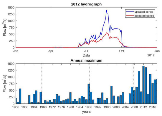 The historical discharge series contains the daily observations of the Garbey Kourou gauging station from 28 June 1956 to 31 December 2018. The flow series was subjected to a major revision in 2019 due to an outdated rating curve that was causing a substantial underestimation of the streamflow. The updated flow series fits much more of the river behavior (Figure 2). The hydrological analysis of the dataset highlighted three changepoints in 1968, 1989, and 2008, representing four climatic periods: (1) 1956–1967 wet period, (2) 1968–1988 great drought, (3) 1989–2007 rainfall and flow augmentation, and (4) 2008–present day flood period [30]. The flood period is characterized by the increase of the annual flow maxima and the flood-related damages [6]. Following the changepoints, the decision of considering only the river flow of the last period (2008–2018) was made.
