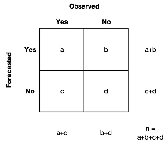 Contingency table used to calculate the categorical indices. Each letter indicates the number of times the specific event occurs: a = “hits”, b = “false alarms”, c = “misses”, d = “correct negatives”.