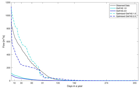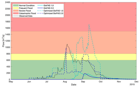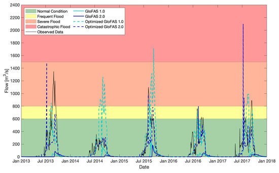 The results jointly considered the four forecasted series (5 days GloFAS 1.0 and 2.0 both in original and optimized format) and compared them with the observed flow series. The analysis timeframe covered the five years (2013–2017) of verification.